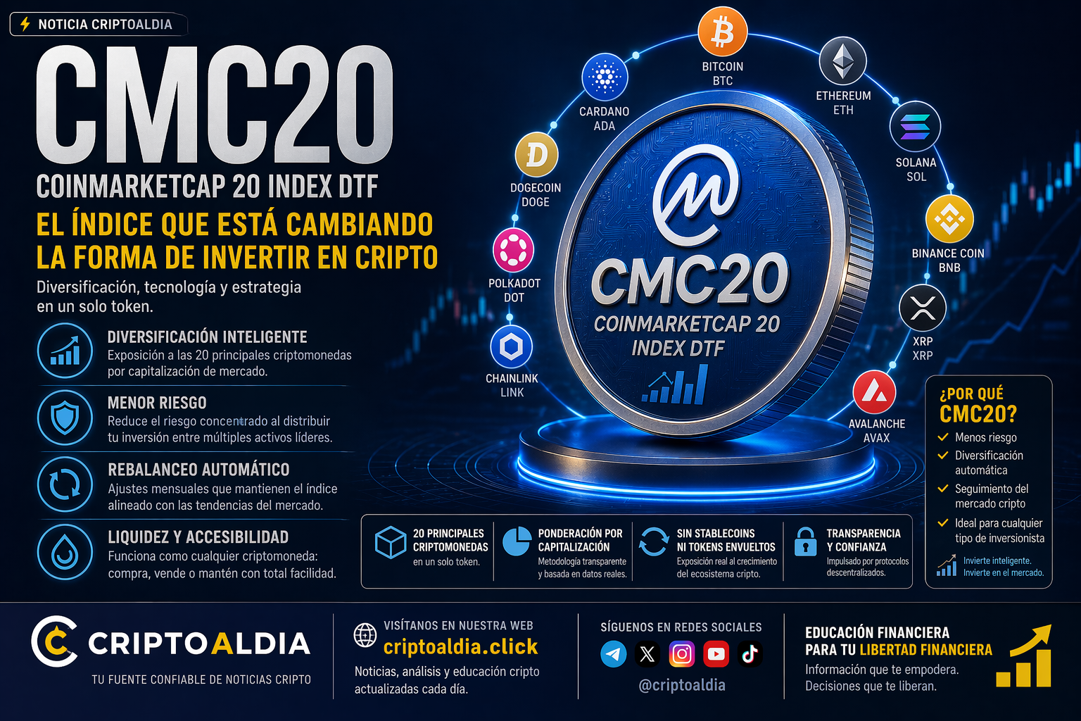 El CMC20 enseña una lección clave: diversificar no es opcional, es estratégico. En lugar de perseguir la “cripto ganadora”, este tipo de activos permite capturar el crecimiento del mercado completo. La educación financiera consiste en entender cuándo conviene asumir riesgo concentrado y cuándo optar por estabilidad. La libertad financiera no depende solo de acertar una inversión, sino de construir un sistema que funcione incluso cuando te equivocas. Aquí no se trata de adivinar, sino de estructurar inteligencia en tu portafolio.