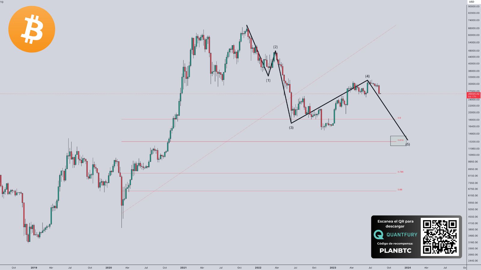 Análisis Técnico y Predicción a Medio Plazo: El escenario predice una corrección significativa en el precio de BTC, basada en el análisis de las ondas y el retroceso del 0.618 de la onda alcista anterior. La expectativa de una caída a nuevos mínimos anuales o incluso hasta los 20K es una advertencia para los inversores, pero también está respaldada por un razonamiento técnico, como la relación entre las ondas 1 y 3.