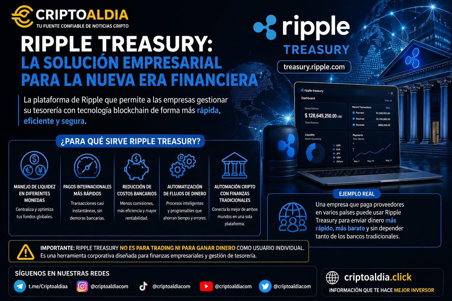 Es importante destacar que Ripple Treasury no está diseñado para inversionistas individuales ni para actividades de trading. Su enfoque es estrictamente corporativo, orientado a resolver desafíos complejos de tesorería empresarial. En este sentido, su adopción representa un paso hacia la convergencia entre finanzas tradicionales y tecnología blockchain. Para las empresas, esto significa no solo reducir costos y tiempos, sino también posicionarse estratégicamente en una nueva era financiera donde la digitalización del dinero es cada vez más relevante.